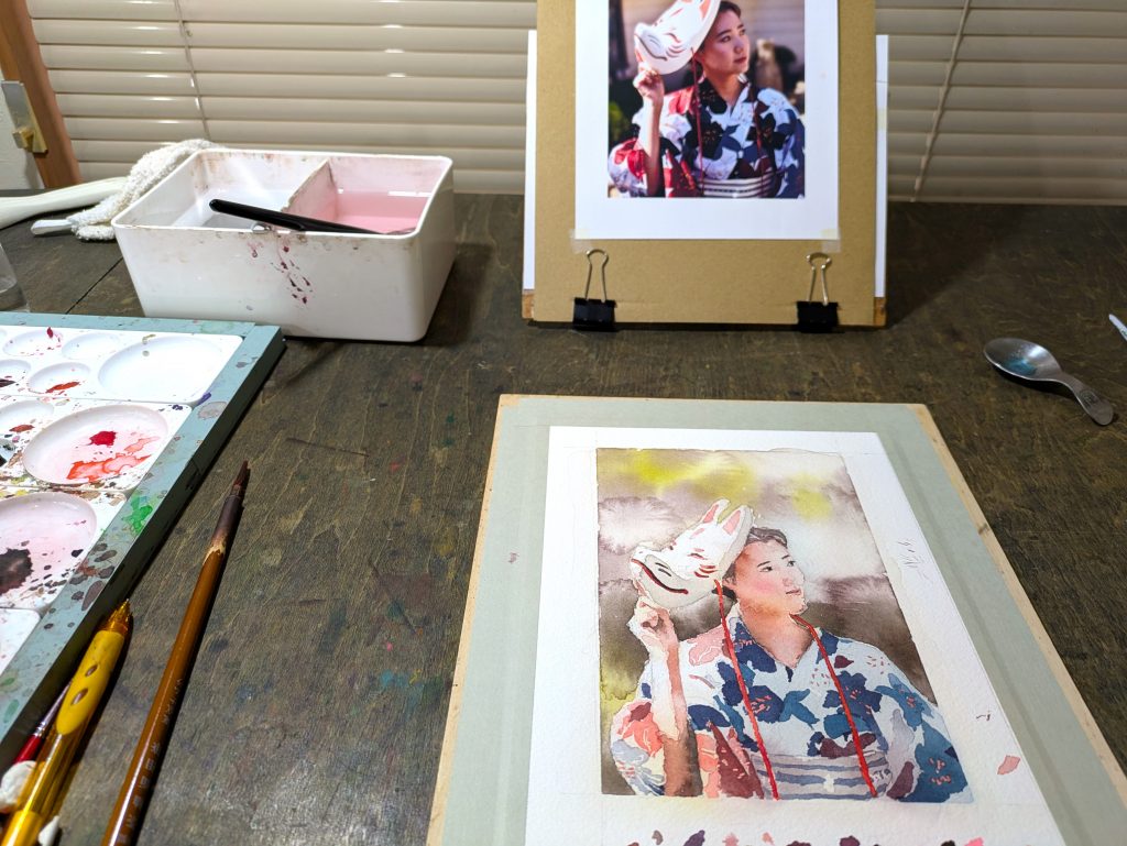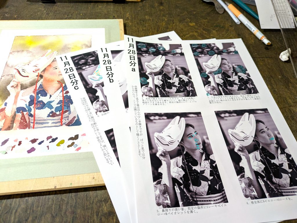 文字にしたためた方がずっと伝わりやすいので、教室で絵を教えるにあたっては 混色する色や、その色を画面のどこへどう塗るかを示したテキストを作って生徒さんたちに配布して、各々のペースで自由にやってもらっています。